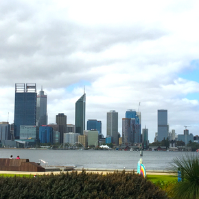 The black swan (Cygnus atratus) is a large waterbird that is prolific in the southwest of Australia. They are nomadic, with erratic migration patterns dependent upon climatic conditions. This image is from the Mends St South Perth foreshore, looking across to Perth city.