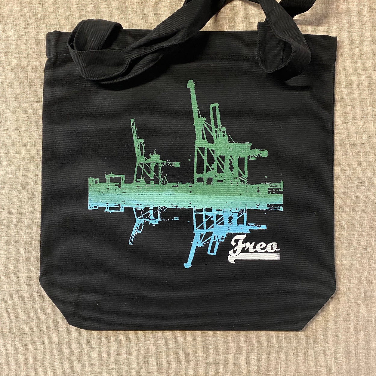 Screen printed image of container cranes reflected in glassy water. An iconic image from Fremantle.